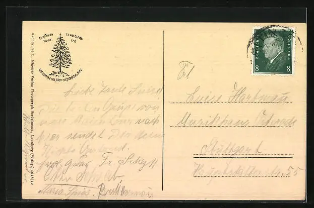 Personenbezogene Daten auf der Rückseite der Karte wurden durch blauen Textmarker unkenntlich gemacht. Die blauen Stellen sind auf die Vorderseite durchgeweicht und wirken sich negativ auf das Postkartenfoto aus