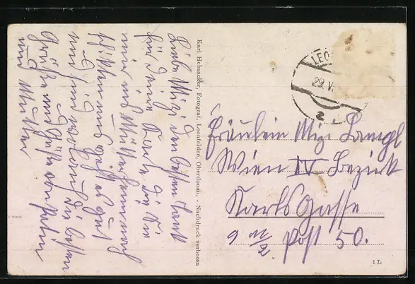 Personenbezogene Daten auf der Rückseite der Karte wurden durch blauen Textmarker unkenntlich gemacht. Die blauen Stellen sind auf die Vorderseite durchgeweicht und wirken sich negativ auf das Postkartenfoto aus