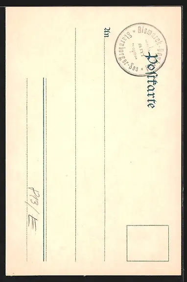 Personenbezogene Daten auf der Rückseite der Karte wurden durch blauen Textmarker unkenntlich gemacht. Die blauen Stellen sind auf die Vorderseite durchgeweicht und wirken sich negativ auf das Postkartenfoto aus