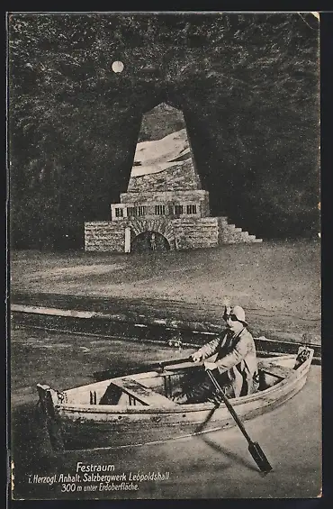 AK Leopoldshall i. Herzogl. Anhalt, Festraum Salzbergwerk u. Mann im Boot bei Mondschein