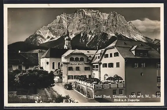 AK Lermoos, Hotel Post mit Blick auf die Zugspitze