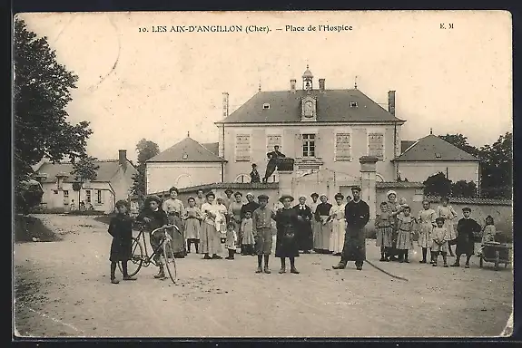 AK Les Aix-d`Angillon, Place de l`Hospice avec groupe de villageois devant le bâtiment
