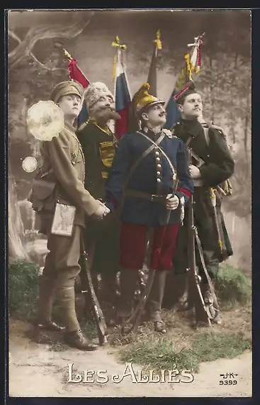 AK Les Allieés, Russischer Soldat in Uniform mit Gewehr und Fahne