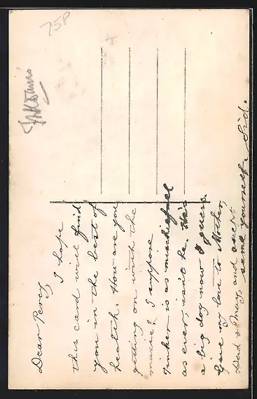 Personenbezogene Daten auf der Rückseite der Karte wurden durch blauen Textmarker unkenntlich gemacht. Die blauen Stellen sind auf die Vorderseite durchgeweicht und wirken sich negativ auf das Postkartenfoto aus