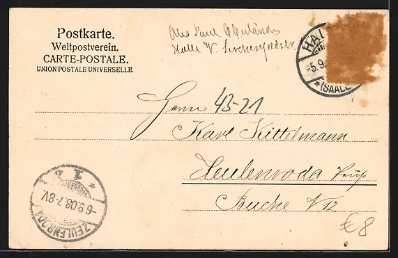 alte Ansichtskarte, gelaufen 1908, Briefmarke entfernt, rückseitig Klebe- und Papierreste, guter Zustand