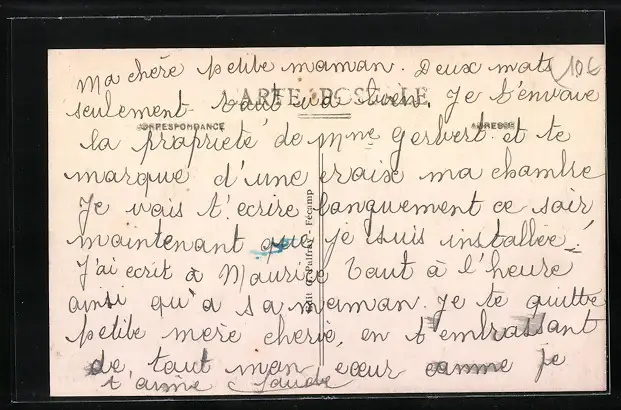 Personenbezogene Daten auf der Rückseite der Karte wurden durch blauen Textmarker unkenntlich gemacht. Die blauen Stellen sind auf die Vorderseite durchgeweicht und wirken sich negativ auf das Postkartenfoto aus