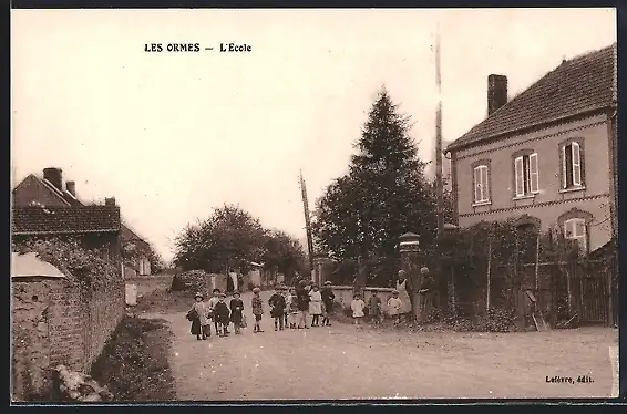 AK Les Ormes, L`École et les écoliers sur le chemin de l`école