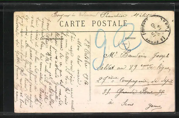 gelaufen 1914 als Feldpost, leicht fleckig, sonst guter Zustand
