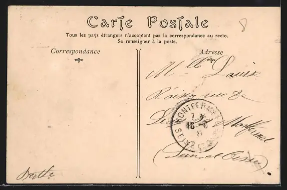Personenbezogene Daten auf der Rückseite der Karte wurden durch blauen Textmarker unkenntlich gemacht. Die blauen Stellen sind auf die Vorderseite durchgeweicht und wirken sich negativ auf das Postkartenfoto aus