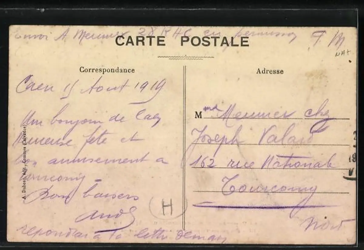 Personenbezogene Daten auf der Rückseite der Karte wurden durch blauen Textmarker unkenntlich gemacht. Die blauen Stellen sind auf die Vorderseite durchgeweicht und wirken sich negativ auf das Postkartenfoto aus