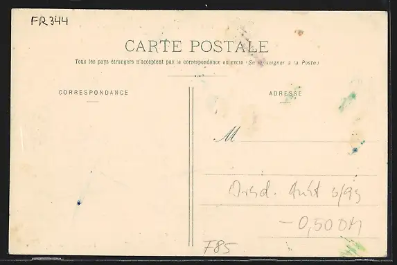 Personenbezogene Daten auf der Rückseite der Karte wurden durch blauen Textmarker unkenntlich gemacht. Die blauen Stellen sind auf die Vorderseite durchgeweicht und wirken sich negativ auf das Postkartenfoto aus