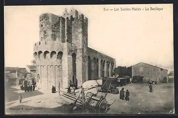 AK Les Saintes-Maries, La Basilique avec scène de vie quotidienne