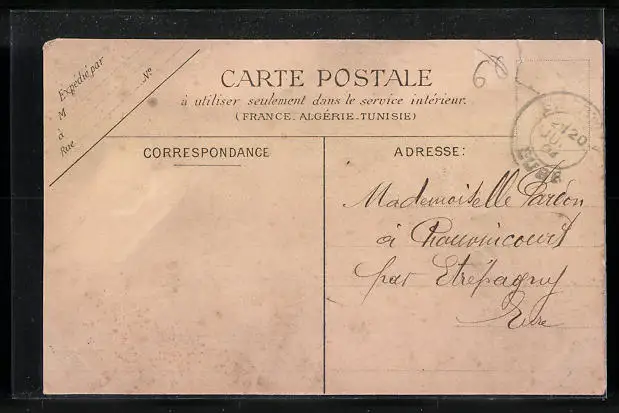 Personenbezogene Daten auf der Rückseite der Karte wurden durch blauen Textmarker unkenntlich gemacht. Die blauen Stellen sind auf die Vorderseite durchgeweicht und wirken sich negativ auf das Postkartenfoto aus