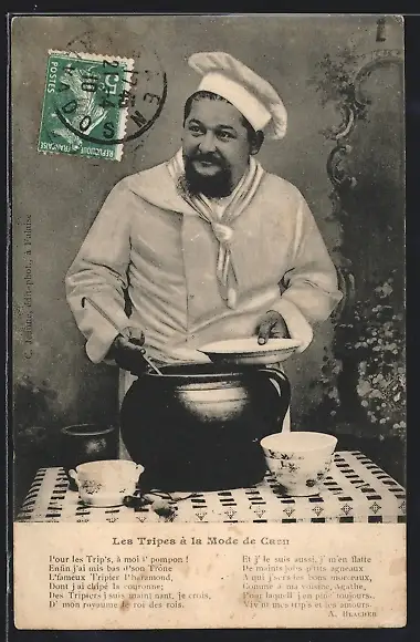 AK Les Tripes à la Mode de Caen, Koch mit Eintopf