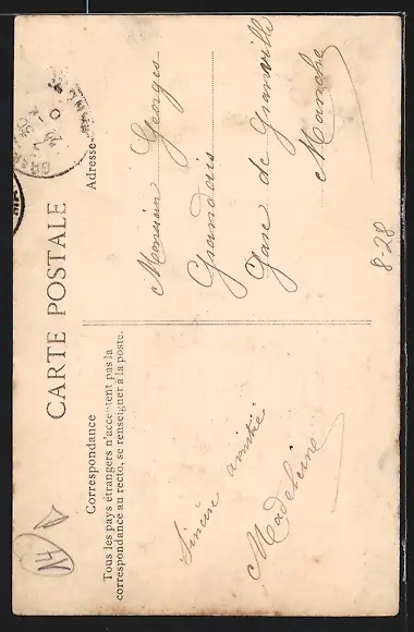 Personenbezogene Daten auf der Rückseite der Karte wurden durch blauen Textmarker unkenntlich gemacht. Die blauen Stellen sind auf die Vorderseite durchgeweicht und wirken sich negativ auf das Postkartenfoto aus