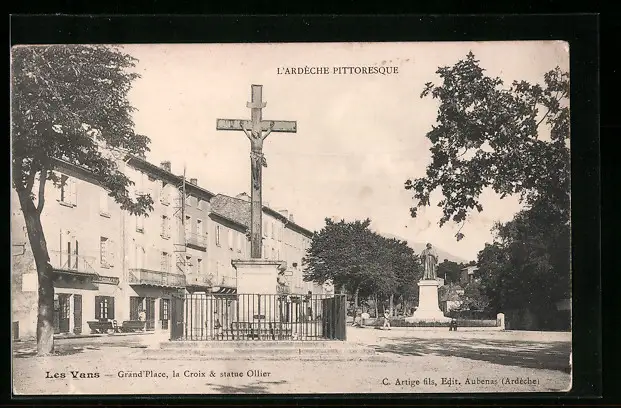 AK Les Vans, Grand Place, la Croix & statue Ollier