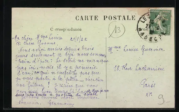 Personenbezogene Daten auf der Rückseite der Karte wurden durch blauen Textmarker unkenntlich gemacht. Die blauen Stellen sind auf die Vorderseite durchgeweicht und wirken sich negativ auf das Postkartenfoto aus