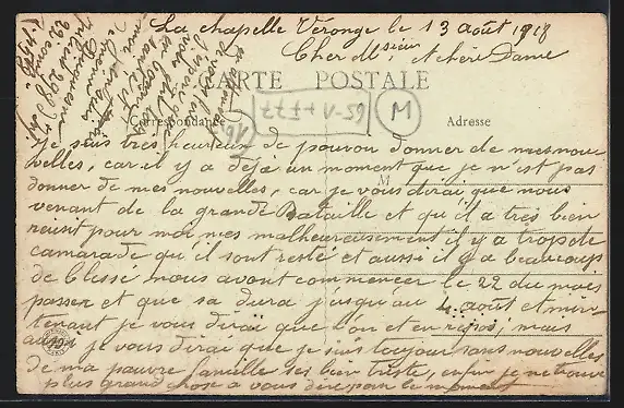 Personenbezogene Daten auf der Rückseite der Karte wurden durch blauen Textmarker unkenntlich gemacht. Die blauen Stellen sind auf die Vorderseite durchgeweicht und wirken sich negativ auf das Postkartenfoto aus