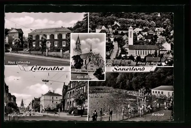 AK Letmathe /Sauerland, Haus Letmathe, neue ev. Kirche und Freibad