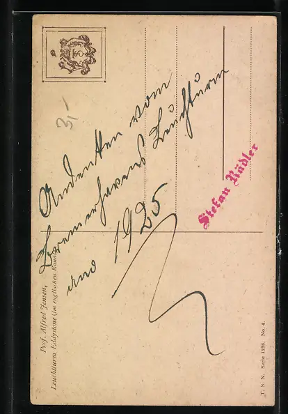 Personenbezogene Daten auf der Rückseite der Karte wurden durch blauen Textmarker unkenntlich gemacht. Die blauen Stellen sind auf die Vorderseite durchgeweicht und wirken sich negativ auf das Postkartenfoto aus
