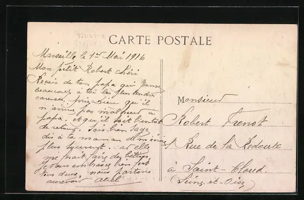 Personenbezogene Daten auf der Rückseite der Karte wurden durch blauen Textmarker unkenntlich gemacht. Die blauen Stellen sind auf die Vorderseite durchgeweicht und wirken sich negativ auf das Postkartenfoto aus