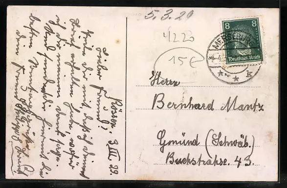 Personenbezogene Daten auf der Rückseite der Karte wurden durch blauen Textmarker unkenntlich gemacht. Die blauen Stellen sind auf die Vorderseite durchgeweicht und wirken sich negativ auf das Postkartenfoto aus