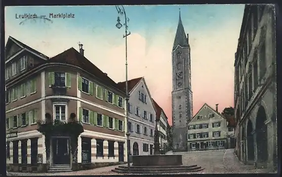 AK Leutkirch, Marktplatz mit Geschäft und Brunnen