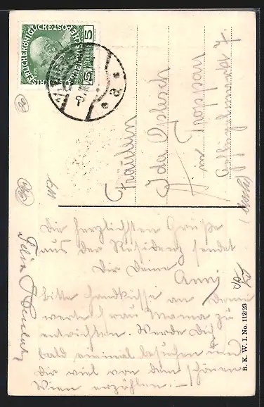 Personenbezogene Daten auf der Rückseite der Karte wurden durch blauen Textmarker unkenntlich gemacht. Die blauen Stellen sind auf die Vorderseite durchgeweicht und wirken sich negativ auf das Postkartenfoto aus