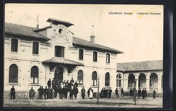 AK Lézignan, L`Hôpital-Hospice avec des personnes devant le bâtiment
