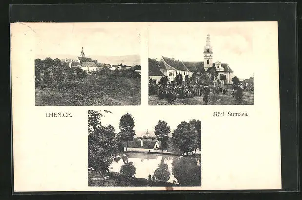 AK Lhenice, Jizni Sumava, Panorama mit Kirche, Teich
