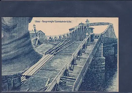 AK Libau - Gesprengte Eisenbahnbrücke, nicht gelaufen von ca. 1920, Rückseite eine Klebestelle.