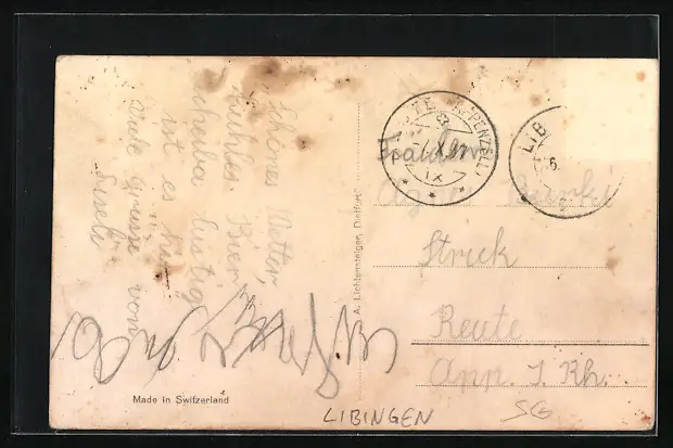 Personenbezogene Daten auf der Rückseite der Karte wurden durch blauen Textmarker unkenntlich gemacht. Die blauen Stellen sind auf die Vorderseite durchgeweicht und wirken sich negativ auf das Postkartenfoto aus