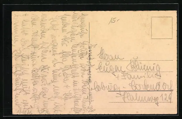 Personenbezogene Daten auf der Rückseite der Karte wurden durch blauen Textmarker unkenntlich gemacht. Die blauen Stellen sind auf die Vorderseite durchgeweicht und wirken sich negativ auf das Postkartenfoto aus