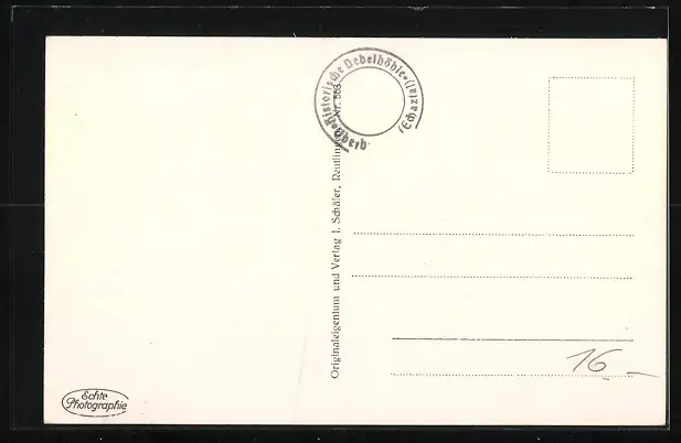 Personenbezogene Daten auf der Rückseite der Karte wurden durch blauen Textmarker unkenntlich gemacht. Die blauen Stellen sind auf die Vorderseite durchgeweicht und wirken sich negativ auf das Postkartenfoto aus