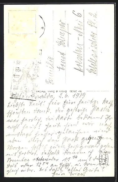 Personenbezogene Daten auf der Rückseite der Karte wurden durch blauen Textmarker unkenntlich gemacht. Die blauen Stellen sind auf die Vorderseite durchgeweicht und wirken sich negativ auf das Postkartenfoto aus