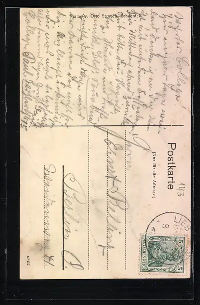 Personenbezogene Daten auf der Rückseite der Karte wurden durch blauen Textmarker unkenntlich gemacht. Die blauen Stellen sind auf die Vorderseite durchgeweicht und wirken sich negativ auf das Postkartenfoto aus