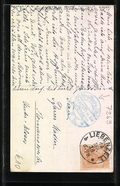 Personenbezogene Daten auf der Rückseite der Karte wurden durch blauen Textmarker unkenntlich gemacht. Die blauen Stellen sind auf die Vorderseite durchgeweicht und wirken sich negativ auf das Postkartenfoto aus