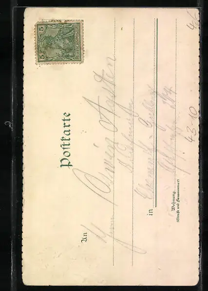 Personenbezogene Daten auf der Rückseite der Karte wurden durch blauen Textmarker unkenntlich gemacht. Die blauen Stellen sind auf die Vorderseite durchgeweicht und wirken sich negativ auf das Postkartenfoto aus