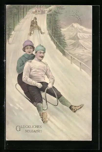 AK Liebespaar fährt auf einem Schlitten einen Berg abwärts