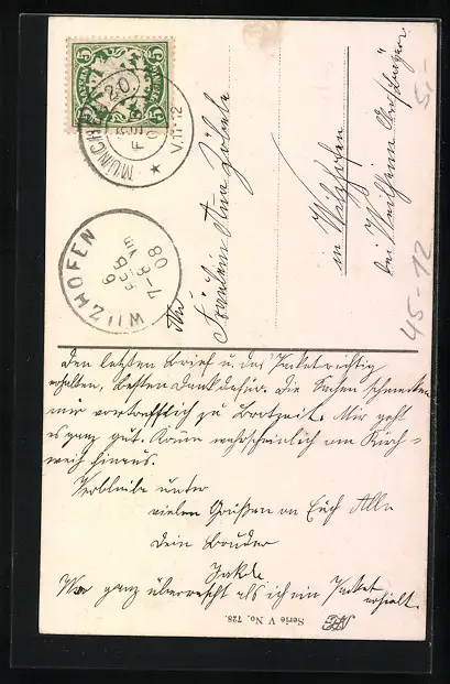 alte Ansichtskarte, gelaufen 1908, Eckknick re. oben, Oberflächenschaden re. oben, guter Zustand