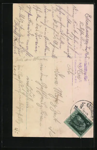 Personenbezogene Daten auf der Rückseite der Karte wurden durch blauen Textmarker unkenntlich gemacht. Die blauen Stellen sind auf die Vorderseite durchgeweicht und wirken sich negativ auf das Postkartenfoto aus