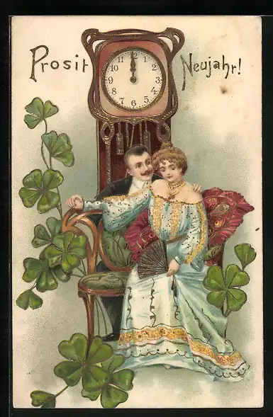 AK Liebespaar sitzt neben einer Uhr umgeben von Kleeblättern, Prosit Neujahr
