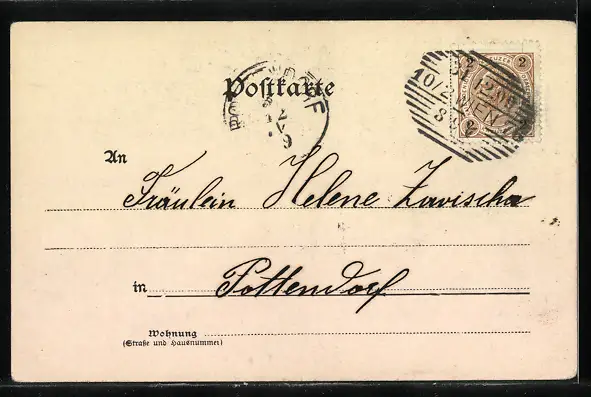 Personenbezogene Daten auf der Rückseite der Karte wurden durch blauen Textmarker unkenntlich gemacht. Die blauen Stellen sind auf die Vorderseite durchgeweicht und wirken sich negativ auf das Postkartenfoto aus