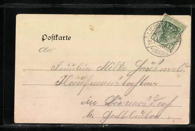 Personenbezogene Daten auf der Rückseite der Karte wurden durch blauen Textmarker unkenntlich gemacht. Die blauen Stellen sind auf die Vorderseite durchgeweicht und wirken sich negativ auf das Postkartenfoto aus
