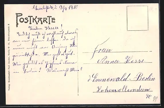 Personenbezogene Daten auf der Rückseite der Karte wurden durch blauen Textmarker unkenntlich gemacht. Die blauen Stellen sind auf die Vorderseite durchgeweicht und wirken sich negativ auf das Postkartenfoto aus