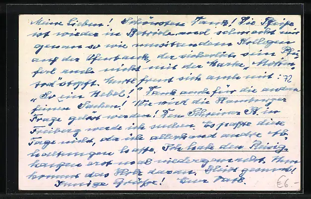 Personenbezogene Daten auf der Rückseite der Karte wurden durch blauen Textmarker unkenntlich gemacht. Die blauen Stellen sind auf die Vorderseite durchgeweicht und wirken sich negativ auf das Postkartenfoto aus