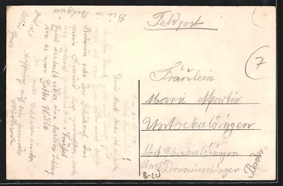 Personenbezogene Daten auf der Rückseite der Karte wurden durch blauen Textmarker unkenntlich gemacht. Die blauen Stellen sind auf die Vorderseite durchgeweicht und wirken sich negativ auf das Postkartenfoto aus