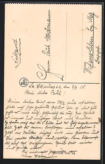Personenbezogene Daten auf der Rückseite der Karte wurden durch blauen Textmarker unkenntlich gemacht. Die blauen Stellen sind auf die Vorderseite durchgeweicht und wirken sich negativ auf das Postkartenfoto aus
