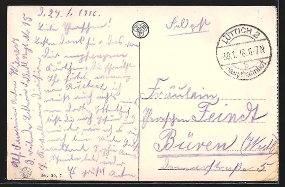 gelaufen 1916, Eckknicke re. und unten li., guter Zustand