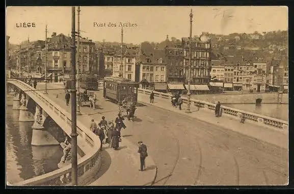 AK Liege, Pont Leopola mit Strassenbahnen